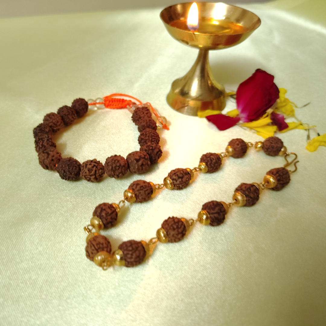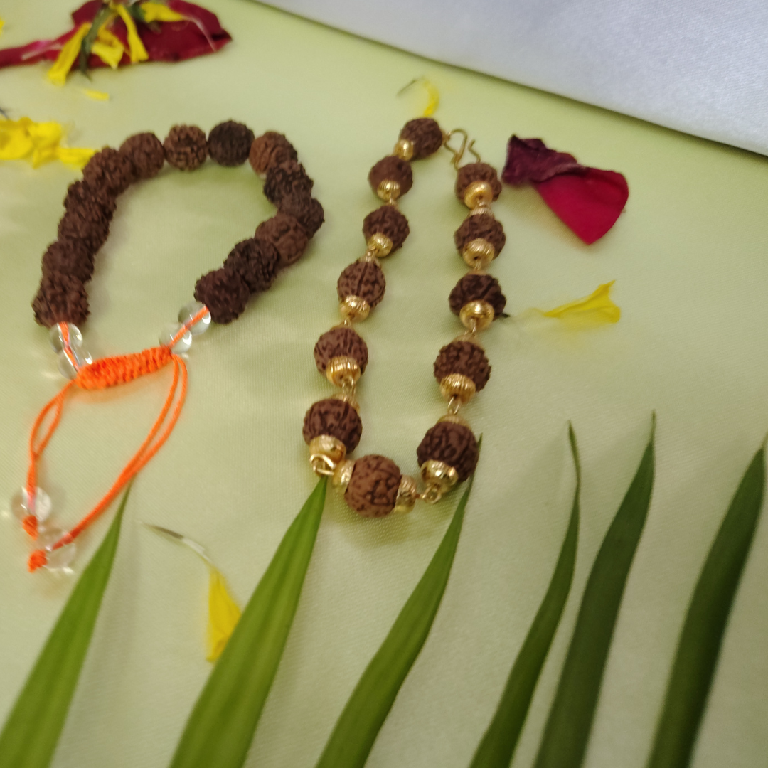 Dual Divine Power: A sacred pair of gold -finish and ethnic Rudraksha bracelet.
